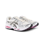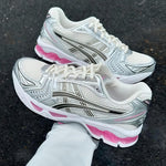 L'ASICS Gel Kayano 14 « Cream Sweet Pink » arbore une tige en mesh blanc cassé à cellules ouvertes avec des empiècements en cuir synthétique brillant argenté métallisé. De larges lignes noires dessinent les contours arqués des bandes latérales emblématiques, tandis que des touches roses contrastantes soulignent les éléments de la marque qui ornent la languette et le talon. Cette chaussure rétro est dotée d'une semelle intermédiaire en mousse blanche avec un amorti Gel visible teinté d'un rose vif. Sous le pied, la semelle extérieure en caoutchouc présente des rainures de flexion et un cambrion en TPU apparent.