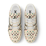 Cette édition de la sneaker LV Trainer fait partie d'une collection capsule de maroquinerie, de prêt-à-porter et d'accessoires co-créée avec Tyler. Elle est confectionnée en cuir de veau grainé, imprimé du motif Monogram, réinterprété en couleur par Tyler. Ce modèle culte, créé à l'origine par Virgil Abloh, s'inspire des baskets de basket vintage.