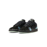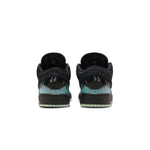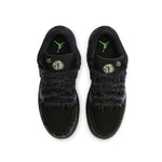 La chaussure présente une tige en suède noir avec des motifs de flammes bleues sur les côtés, ajoutant une touche lumineuse sur cette basket plutôt sombre. Les lacets ébouriffés et les yeux lumineux sur la languette renforcent l’ambiance effrayante et festive. Une semelle extérieure phosphorescente complète le look, illuminant vos pas dans l’obscurité.