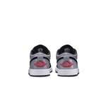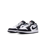La Air Jordan 1 Low SE « White Black Matte Silver » arbore une tige en cuir lisse, avec une base blanche immaculée et des touches noires contrastantes sur l'œillet, le Swoosh et l'empeigne. Une finition argentée réfléchissante est appliquée sur le col et le talon, ornés du logo Wings cousu en rouge feu. Un logo Jumpman rouge assorti orne la languette en nylon noir.